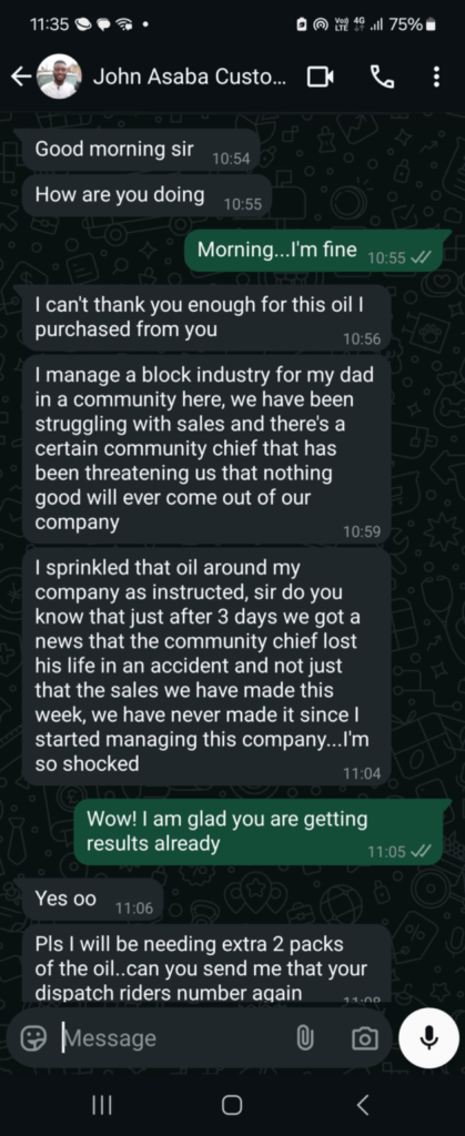 If you have experienced any of the signs listed above, then the “witchcraft destroying oil” is your solution. it will completely destroy the root of witchcrafts manipulations in your life.